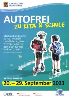 Mit der Aktion "Autofrei zu Kita und Schule" ruft das Landratsamt Donau-Ries im Zeitraum vom 20. - 29. September 2023 Eltern von Kindergarten- und Grundschulkindern auf, den Weg zur Kita oder Grundschule zu Fuß, mit dem Tretroller, dem Lauf-/Fahrrad oder mit öffentlichen Verkehrsmitteln zurückzulegen.