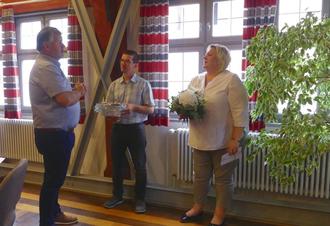 VG Vorsitzender Karl Kolb bedankte sich für die bisherige Arbeit und betonte wie wichtig es sei, dass man sich an seinem Arbeitsplatz wohl fühle. Nur so kann man schließlich das Beste aus sich heraus holen und hervorragende Ergebnisse für sich selbst und die Bürger der Verwaltungsgemeinschaft hervorbringen. Er wünschte den Beiden nicht nur viel Glück, sondern auch weiterhin viel Spaß bei der Arbeit und immer nette Kollegen.