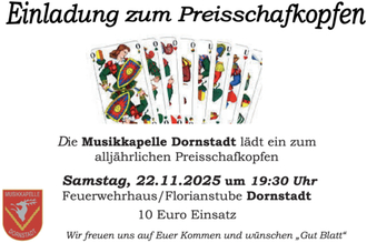 Die Musikkapelle Dornstadt lädt zu ihrem alljährlichen Preisschafkopfen am Samstag, 22. November 2025, um 19.30 Uhr in die Florianstube des Feuerwehrhauses in Dornstadt ein.