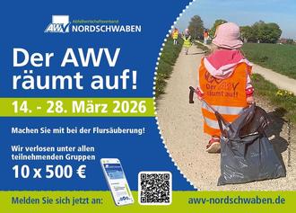 Die nächste Riesenflursäuberung des Abfallwirtschaftsverband Nordschwaben „Der AWV räumt auf!“ findet vom 14. bis 28. März 2026 in den Landkreisen Dillingen und Donau-Ries statt.