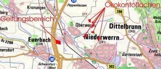 In den Geltungsbereich werden die Flurstücke 1711, 1712, 1712/1, 1716 und 1717/1 und Teilflächen der Flurstücke 1715, 1408 und 1411 der Gemarkung Oberwerrn sowie die Grundstücke Fl.Nr. 309/1 und 396 und Teilflächen der Grundstücke Fl.Nr. 377 und 435 der Gemarkung Niederwerrn einbezogen. Das Gewerbegebiet liegt südwestlich des bestehenden Siedlungsgebiets zwischen der BAB 71, der SW 10 und dem bestehenden Gewerbegebiet. Die Lage ergibt sich aus der Karte.
