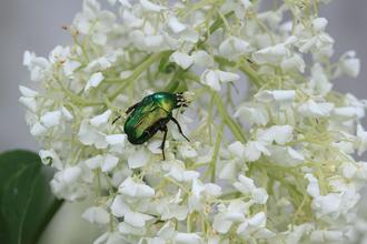 Der „erwachsene“ Gemeine Rosenkäfer ist 14 bis 20 mm lang und durch seine grün-gold-glänzende Deckfarbe ein sehr auffälliger Käfer. Er ist durch die Bundesartenschutzverordnung geschützt und darf nicht getötet werden. Das gilt natürlich auch für das Larvenstadium. Den Käfer kann man von April bis September an Rosen, Schneeball, Hartriegel, Holunder, Flieder sowie an Disteln und Doldenblütler beobachten. Er ernährt sich von Pollen, Blütenblättern und süßen Pflanzenteilen und richtet in dieser Lebensphase keinen nennenswerten Schaden an Pflanzen an.