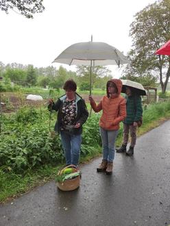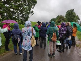 Gut 20 Personen ließen sich auch von teilweise heftigen Regenfällen nicht abhalten und sind er Einladung der Gleichstellungsbeauftragten der Gemeinde zur Kräuterführung in die Niederwerrner Flur gefolgt. Rita Popp, die moderne Kräuterhexe, die sich selbst Hagesuse nennt, führte die Gruppe in die Geheimnisse der Naturheilkräfte heimischer „Unkräuter“ ein.