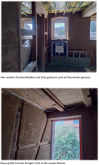 Der Markt Werneck unterstützte mit dem Kommunalen Förderprogramm, das Amt für Ländliche Entwicklung (ALE) mit der Werntaldorf-Förderung. Die Antragstellungen verliefen unkompliziert, einzig die Angebotseinholung gestaltet sich schwierig, erzählt Jens Stühler. Denn bei einigem lässt sich erst in der Bauphase erkennen, was eigentlich gemacht werden muss, auch entstehen neue Idee, wie man es angehen könnte. Hinzu kommt die Eigenleistung. Das aus dem alten Anwesen etwas sehr Schönes und Individuelles entsteht ist schon jetzt sichtbar, auch wenn es noch viel zu tun gibt. Für Ende 2025 ist der Einzug geplant.