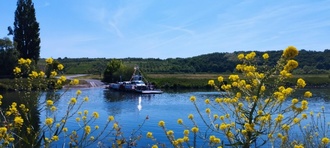 Die Exkursionsteilnehmenden auf einer Fährfahrt in die ILE Mainschleife Plus