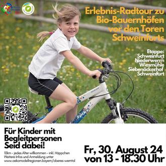 Das Angebot richtet sich an alle Kinder, die gut und gerne Radfahren, gemeinsam mit ihren Eltern oder Begleitpersonen. Jüngere Kinder können gerne im Fahrradsitz/Anhänger o.Ä. mitgenommen werden. Tourlänge ca. 10km, Helmpflicht, Begleitpersonen haften für ihre Kinder, bitte wetterangepasste Kleidung und Wasser für unterwegs mitbringen, Teilnahmegebühr auf solidarischer Basis zwischen 5 € und 10 € pro Erwachsene/r, je nach finanzieller Möglichkeit, Kinder frei. Anmeldung erforderlich bei der Öko-Modellregion unter oekomodellregion@oberes-werntal.org oder 09726 9067-24. Findet nicht statt bei Unwetter. Bitte am Veranstaltungstag kurz vorher auf die Website www.oekomodellregionen.bayern/oberes-werntal/termine schauen, ob die Radtour wirklich stattfindet.