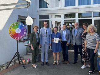 Im Bild, von links: Bürgermeisterin Bettina Bärmann, Landrat Florian Töpper, Familienstützpunktleitung Ingeborg Dümpert, 3. Bürgermeister und Gemeinderat Florian Negwer, 2. Bürgermeister und Gemeinderat Thomas Wohlfahrt, Kerstin Rink (Bereich „Frühe Hilfen“ Landkreis Schweinfurt), Andrea Handwerker (Bereich „Familienbildung“ Landkreis Schweinfurt)