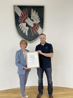 Urkundenübergabe der Gemeinde Niederwerrn mit Bürgermeisterin Bettina Bärman und Daniel Reichel/ÜZ Mainfranken