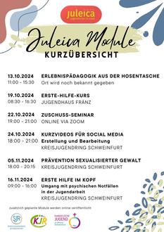 Detaillierte Informationen zu den einzelnen Seminaren findet Ihr auf unserer Website www.kjr-sw.de/events/juleica-seminare/