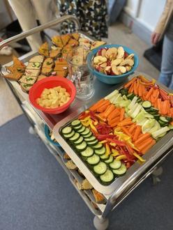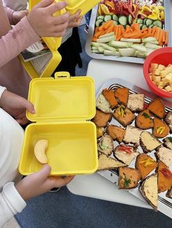 Helfende Hände aus der Elternschaft – vielen Dank! – schnippelten zusammen mit Frau Dümpert von der Öko-Modellregion Oberes Werntal biologisch und regional angebautes Obst und Gemüse. Auf den Tisch kamen außerdem Käse, Brot und vielfältige Aufstriche aus der Umgebung. Frau Dümpert erklärte den Lernenden kindgerecht die Bedeutung der Nachhaltigkeit und Regionalität: „Denn was wir essen beeinflusst nicht nur unsere eigene Gesundheit, sondern leistet auch einen wichtigen Beitrag zum Klima-, Arten- und Bodenschutz.“ (aus: Flyer Öko-Modellregion Oberes Werntal)