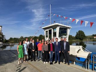 Wipfelds Bürgermeister Tobias Blesch (rechts) begrüßte Landrat Florian Töpper (Dritter von rechts, daneben Abteilungsleiterin Jana Mai) und Mitarbeitende der Verwaltung zum Gemeindedialog in Wipfeld. Das Bild entstand an Bord der Wipfelder Mainfähre.