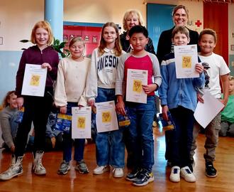 In Beisein von Frau Hochrein, fand dann die Siegerehrung statt. Für alle Kinder, die sich den Aufgaben gestellt hatten, gab es Vierfarb-Stifte, die die VR-Bank gestiftet hatte. 6 Knobel-Füchse mit besonders guten Leistungen erhielten außerdem „Nervennahrung“. Für die Schulsieger Mila und Henry gab es zudem eine Einladung zur 2. Runde. Sie werden am 18. November 2025 die Hugo-von-Trimberg-Schule in Schonungen vertreten und dort gegen die anderen Schulsiegerinnen und –sieger des Landkreises antreten. Dafür wünschen wir viel Erfolg.
