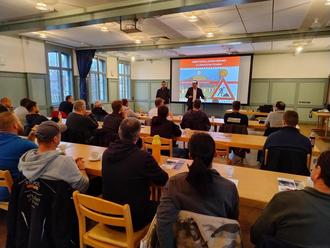 Christian Stütz der Firma Ortner GmbH Verkehrstechnik (Niederlauer) schulte auf Initiative der ILE Oberes Werntal rund 25 Teilnehmer aus acht ILE Gemeinden zur vorschriftsmäßigen Sicherung des Straßenverkehrs für Baustellen und Veranstaltungen im Fränkischen Hof in Geldersheim.