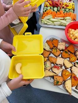 Die Aktion wurde von der Ökö-Modellregion Oberes Werntal in Zusammenarbeit mit engagierten ehrenamtlichen Helfer/-innen organisiert. Ein herzliches Dankeschön an dieser Stelle geht an Frau Ingeborg Dümpert sowie an die fleißigen Eltern unserer Erstklässler, die gemeinsam biologisch und regional angebautes Obst und Gemüse an diesem Vormittag schnippelten. Dieses, als auch Käse, Brot und vielfältige Aufstriche aus der Umgebung bescherten den Kindern ein reichhaltiges, leckeres und gesundes Frühstücksbuffet. Dabei erklärte Frau Dümpert kindgerecht die Bedeutung der Nachhaltigkeit und Regionalität. Zudem erhielten unsere jüngsten Schüler eine wiederverwendbare und aus recyclebarem Bio-Kunststoff hergestellte Brotbox, die uns immer daran erinnern soll, auf gesunde und bioregionale Lebensmittel zu achten. Rundum war diese Bio-Brotboxaktion für uns alle ein gelungenes und lehrreiches Erlebnis!