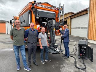 Quasi „zum Abschied“ hat Norbert Müller (Zweiter von rechts), der Ende November in den Ruhestand verabschiedet wurde, noch einen vollelektrischen Streuautomaten für den Winterdienst angeschafft und dem Kreisbauhof übergeben. Im Herbst wurde das neue Gerät vor den Augen von Landrat Florian Töpper (rechts), Joachim Bördlein (Leiter Kreisbauhofstützpunkt Gerolzhofen, links) und Maurice-Riccardo Schmitt (daneben) erstmals testweise in Betrieb genommen.