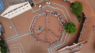 Den krönenden Abschluss dieses gelungenen Tages bildete ein „Zeichen des Friedens“, bei dem die Schülerschaft ein überdimensionales Peace-Zeichen auf dem Pausenhof nachstellte. Vor allem aus der Vogelperspektive war dies, ebenso wie die Friedenskette, ein beeindruckendes Statement. Um dieses auch in die Welt hinauszuschicken, ließen einige Schüler zu den Klängen von Udo Lindenbergs „Wir ziehen in den Frieden“ weiße Ballons als Friedensboten in den Himmel steigen.