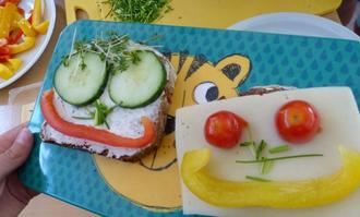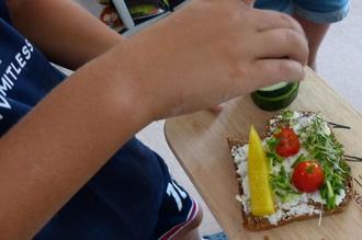 Nach dem gemeinsamen Füllen eines mitgebrachten Kühlschrank-Modells kam das Highlight: Das Zubereiten von Bananenjoghurt und Brotgesichtern. Die Schülerinnen und Schüler waren mit Feuereifer dabei und schnippelten Paprika und Tomaten, zerkleinerten Schnittlauch und Kresse und rührten Joghurt an. Im Anschluss wurden die selbst belegten Brotgesichter verzehrt und alle ließen sich den selbstgemachten Bananenjoghurt schmecken.