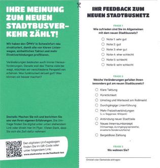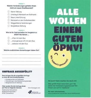 zur Zeit läuft eine Kundenzufriedenheitsbefragung der Bürger / Buskunden zum Thema Schweinfurter Stadtbus, initiiert von der Stadt Schweinfurt. Alle Kunden der Stadtwerke Schweinfurt erhalten somit die Chance, sich zu äußern und ihre Wünsche und Anregungen kundzutun. Wichtig wäre, das gesamte Spektrum abzudecken, also Lob ebenso wie Tadel. Nur so ergibt sich ein gesamtheitliches Bild.