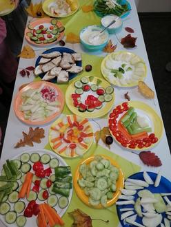 Morgens bereiteten die Kinder, von einigen Eltern unterstützt, in ihrer jeweiligen Gruppe / Klasse ein gesundes Frühstück vor, bevor sich alle gemeinsam in der Turnhalle trafen um sich hier mit einem gemeinsamen Lied zu begrüßen. Das eigentliche Frühstück fand dann in den Kindergarten- und Klassenräumen statt, wobei jedes Schul- und Vorschulkind wählen konnte, wo und mit wem es essen möchte. Eine ordentliche Durchmischung war ausdrücklich erwünscht. Nach einer freien Spiel- und Erkundungszeit, trafen sich alle noch einmal in der Turnhalle um dort ein flottes Herbstlied mit Tanz einzuüben.