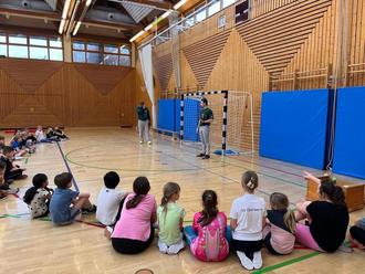 Unsere Schüler lernten von ihren „Coaches“ Frank und Frederik als Erstes die „Basics“. Wie werfe ich so ein Baseball genau und wie fange ich mit dem Baseball-Handschuh? Diese Basics wurden in zwei Stationen trainiert bis es dann zum heißbegehrten Playball-Spiel kam. Dieses ähnelt in der Basis unserem schulinternen geliebten Brennballspiel. Dadurch hatten unserer Schüler die Spielzüge schnell verstanden, nur den Baseball mit dem Schläger treffen war gar nicht so einfach…Die Freude und Begeisterung für den Baseball-Sport war spürbar gegeben! Die Kinder der 3. und 4. Klasse, die Jugendlichen der 5. und 6. Klasse sowie die Mittelschüler aus dem Ankerzentrum hatten sichtlich großen Spaß! Wer weiß, vielleicht sucht ja der ein oder andere die DJK Schweinfurt zum Baseball-Schnupper-Training mal auf.