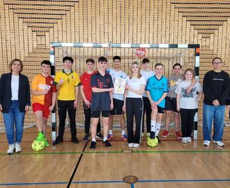 Im Finale sollte es dann deutlich enger zugehen. Der 2:0-Vorsprung der 7a konnte zwar zügig ausgeglichen werden und die M9a lag sogar zwischenzeitlich mit 4:2 in Führung, nach dem umjubelten Ausgleich der Klasse 7a zum 4:4 drohte die Partie allerdings kurzzeitig zu kippen. Allerdings antwortete die Klasse M9a postwendend und ging mit einem Distanzschuss wieder in Führung. Kurz darauf war das Spiel mit dem Treffer zum 6:4 entschieden und das Siegerteam bekam in der anschließenden Siegerehrung den Wanderpokal durch die Schulleitung und den Schülersprechern überreicht.