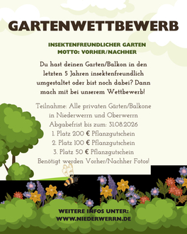 Alle Garten- und Balkonbesitzer in Niederwerrn und Oberwerrn, die in den letzten fünf Jahren ihren Garten/Balkon umgestaltet haben oder gerade noch in der Umsetzung sind, können an diesem Wettbewerb teilnehmen.