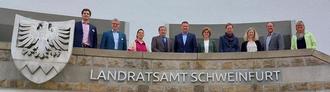 Stellvertretende Landrätin Bettina Bärmann (mittig), die Kooperationspartner Frau Prof. Anja Ohliger (Hochschule Coburg) und das Büro Perleth sowie das Team des Regionalmanagements freuen sich über das Engagement der Modellgemeinden Grettstadt und Stadtlauringen, vertreten durch die jeweiligen Ersten Bürgermeister Jens Machnow (5. von links) und Friedel Heckenlauer (4. von links).