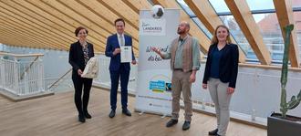 Von links: Eva Krümpel (Kulturmanagerin), Landrat Florian Töpper, Udo Rumpel und Johanna Graf (Regionalmanagerin) freuen sich, dass der Landkreis Schweinfurt weiterhin Fairtrade - Landkreis ist.