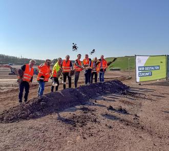 Spatenstich für die Erweiterung der Deponie Rothmühle, von rechts Michael Völlinger (Bickhardt Bau), Bernd Nordheim (Hermanns HTI-Bau), Thomas Fackelmann (Leiter Abfallwirtschaft), Landrat Florian Töpper, Abteilungsleiter Christian Frank, Heiko Glöckler (Leiter Abfallwirtschaftszentrum Rothmühle), Stephan Orzol (stellv. Leiter Abfallwirtschaftszentrum Rothmühle) und Wolfgang Huber (Geschäftsführer Ingenieurbüro AU Consult).