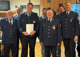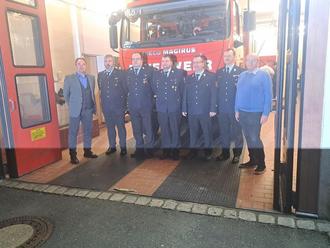 Die neu gewählte Führungsmannschaft der Freiwilligen Feuerwehr Nordhalben: von links 1. Bürgermeister Michael Pöhnlein, 2. Kommandant Stefan Wacher, 1. Kommandant Thorsten Schuberth, ehemaliger 1. Kommandant Daniel Pöhnlein, Kreisbrandmeister Ronny Reuther, Kreisbrandinspektor Markus Wachter, 2. Bürgermeister Ludwig Pötzinger.