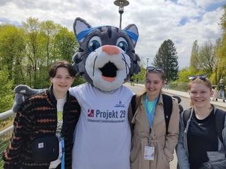 Von links: Lea Sorgenfrei, das Makottchen des Landesturnfestes, Lina Wernard und Tina Eckert
