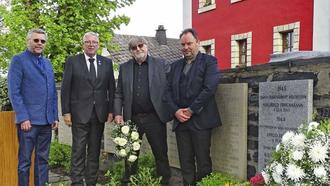 Bürgermeister Michael Pöhnlein (rechts) und Initiator Horst Mohr (2. von rechts), sowie die Vertreter des DGB, Wolfgang Schmitt (links) und des Volksbundes Deutsche Kriegsgräberfürsorge, Robert Fischer (2. von links). (Foto: Norbert Neugebauer)