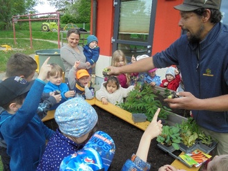 Am Tag danach bekamen wir Unterstützung von Herrn Bumann (Rusticus), der mit uns, unser im letzten Jahr gewonnenes Hochbeet von der Raiffeisenbank, bepflanzte und uns hilfreiche Tipps zum Wachstum und zur Pflege gab. Auch ein paar Pflanzen hatte er umsonst für uns mitgebracht. Vielen herzlichen Dank an Herrn Bumann für seine Hilfe. Ein Dankeschön auch an die Mitarbeiter des Bauhofs, die uns das Hochbeet aufgebaut und zum Kindergarten gebracht haben.