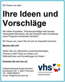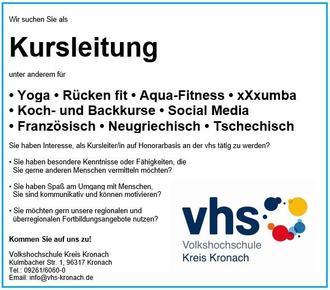 Programminformationen erhalten Sie über unser Gesamtprogramm und die Flyer mit den regionalen Übersichten, die in der Gemeindeverwaltung und bei Banken und Sparkassen ausliegen, sowie über unsere Homepage www.vhs-kronach.de. Sie können kostenlos unter www.vhs-kronach.de/newsletter unseren Newsletter abonnieren. Anmeldungen bitte bei der vhs Kreis Kronach, Kulmbacher Straße 1, 96317 Kronach; Tel. 09261/6060-0 oder unter www.vhs-kronach.de.