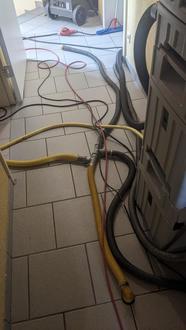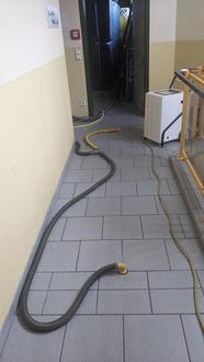 Die Firma Schmand trocknet derzeit die betroffenen Räume in der Nordwaldhalle. Dazu werden durch die erstellten Öffnungen, Luft in die betroffene Bauteile geleitet und an anderer Stelle wieder abgesaugt. (siehe Bilder).