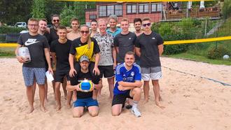 Beim Beachvolleyball-Turnier hat das Team mit Luca Schurig, Chris Müller und Tobias Köstner den ersten Platz belegt. Herzlichen Glückwunsch! Es gingen sechs Teams mit jeweils drei Teilnehmern an den Start. Das Bild zeigt die Teilnehmer des Turniers bei der Siegerehrung.