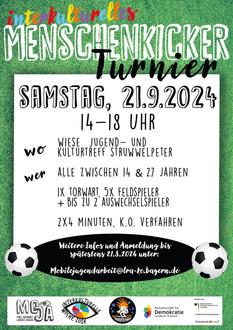 Am Samstag, den 21.09.2024 findet im Rahmen der Interkulturellen Woche unter der Federführung der Mobilen Jugendarbeit Landkreis Kronach und des Jugend- und Kulturtreff Struwwelpeter ein Menschenkicker-Fun-Turnier statt, bei welchem der Spaß und die Gemeinschaft im Vordergrund stehen. Beginn ist um 14 Uhr auf dem Gelände des Struwwelpeters in Kronach (Rodacher Str. 10).