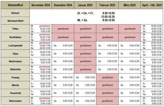 Die Öffnungszeiten der Wertstoffhöfe können Sie der nachfolgenden Abbildung entnehmen oder auf der Homepage des Landratsamtes Kronach unter Bürgerservice/Landratsamt/Behördenwegweiser/ Abfallwirtschaft/Wertstoffhöfe einsehen.
