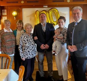 Von links nach rechts: Tochter Elisabeth Zmero, Enkelin Manuela, Jubilarin Marie Wachter, Bürgermeister Michael Pöhnlein, Enkelin Leila mit Urenkel Tristan und Landrat Klaus Löffler.