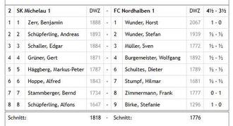In der 6. Runde war der FC Nordhalben beim SK Michelau zu Gast und mußte nach über 4 Stunden Spielzeit eine Niederlage hinnehmen. Nach den Punkteteilungen von Sven Müller und Dieter Schultes, konnte Stefanie Birke ihre Partie nicht halten. Hilmar Stumpf spielte gegen Alfred Hoppe eine solide Partie und nahm das Remisangebot des Michelauers an. Als Horst Wunder am Spitzenbrett gegen den jungen Benjamin Zerr die Segel streichen mußte, kippte die Begegnung. Frank Zimmermann verkürzte mit einen schön heraus gespielten Sieg gegen Bernd Stammberger noch auf 3,5 : 2,5 Punkte, doch das sollte nicht reichen. In den beiden restlichen Partien kamen die Nordhalbener nicht über eine Punkteteilung hinaus. Stefan Wunder konnte gegen Andreas Schüpferling trotz Mehrbauern und Läuferpaar nicht gewinnen und auch Wolfgang Burgemeister mußte durch Zugwiederholung ins remis einwilligen, da der gegnerische Freibauer von Gert Grüner zu stark war. Trotzdem verbleibt der FC Nordhalben auf dem 4.Tabellenplatz und erwarten in 5 Wochen den TSV Kirchenlaibach 1.