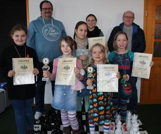 Siegerehrung für die jüngsten Teilnehmerinnen (U8 und U10) mit (hinten, von links) Turnierleiter Tobias Feigel, Frauenschach-Beauftragte im Schachbezirk und Vorsitzende FC Nordhalben, Stefanie Birke, und zweiter Bürgermeister Ludwig Pötzinger.