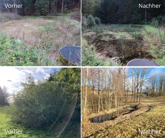 Kleingewässer wie Teiche, Weiher oder Tümpel gehören trotz ihrer geringen Größe oft zu den artenreichsten Biotopen unserer Kulturlandschaft. Sie zählen als Paradies für viele Tierarten, wie z.B. Vögel, Insekten und Amphibien. In Nordhalben konnten wir beispielsweise an einem ehemaligen Fischteich 17 Libellenarten nachweisen, darunter 3 gefährdete Arten, die auf der Roten Liste stehen. Um die Kleingewässer rund um Nordhalben zu fördern, werden durch das Biodiversitätsprojekt in Zusammenarbeit mit dem Fadenmolchprojekt (www.oekologische-bildungsstaette.de/fadenmolch.php) verschiedene Maßnahmen an insgesamt 7 Kleingewässern durchgeführt.