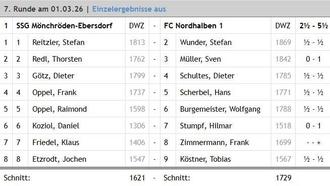 Die 1. Mannschaft hatte bei der SG Mönchroeden /Ebersdorf anzutreten. Kurzfristig musste Nordhalben auf ihren Spitzenspieler Horst Wunder verzichten und so kam Tobias Köstner zu seinem 3. Einsatz und seiner 3. Punkteteilung. Nach 30 Minuten ging Nordhalben durch den kampflosen Sieg von Frank Zimmermann in Führung. Nach dem schön herausgespielten Sieg von Sven Müller folgten Punkteteilungen von Dieter Schultes und Hans Scherbel. Stefan Wunder und Wolfgang Burgemeister willigten ebenfalls in die Punkteteilungen ein und sicherten schon mal den Mannschaftssieg. Für den Schlusspunkt sorgte Hilmar Stumpf, der nach Bauergewinn seine Partie sicher zum Sieg führte. Nach über 3 Stunden siegte Nordhalben mit 5,5 : 2,5 Punkten und verbleibt hinter dem SK Michelau auf den 2.Tabellenplatz.