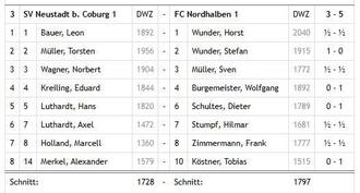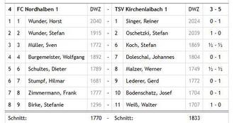 Nach 2 Stunden Spielzeit konnte Sven Müller gegen Stefan Koch eine Punkteteilung erzielen. Kurze Zeit später mussten Hilmar Stumpf und Wolfgang Burgemeister nach Materialverlust aufgeben. Als auch Frank Zimmermann gegen den starken Josef Bodenschatz aufgeben musste, war die Niederlage abzusehen. Stefanie Birke konnte nach Figurenverlust, dank eines starken Freibauern, doch noch gewinnen. Es folgte eine remis, zwischen Dieter Schultes und Werner Malzer, in der der Nordhalbener leichte Vorteile hatte. Stefan Wunder konnte in Zeitnot seinen Gegner Stefan Oschetzki noch überlisten. Am Spitzenbrett konnte Horst Wunder nach Turmtausch das Läufer-Endspiel nicht halten und musste Reiner Singer zum Sieg gratulieren.