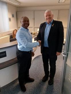 Bürgermeister Jürgen Hennemann begrüßt Dr. Innocent Emeakaroha und die Mitarbeiterinnen in den neu eröffneten Praxisräumen im ersten Stock des Sparkassengebäudes am Marktplatz und wünscht ihm persönlich viel Erfolg für sein Augenarztzentrum und die Verwirklichung seiner umfangreichen Angebote sowie der Praxis viele Patienten.