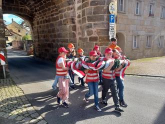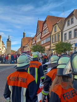 Bild Kinder- und Jugendfeuerwehr tragen den Kranz des Maibaums vom Grauturm zum Marktplatz