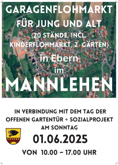 Am Sonntag, den 01.06.2025, von 10 – 17 Uhr findet in Ebern im Mannlehen in Verbindung mit dem Tag der offenen Gartentür in Ebern, Unterpreppach, Jesserndorf und Reutersbrunn ein Garagenflohmarkt (20 Teilnehmer, incl. Kinderflohmarkt, 2 Gärten - Umgestaltung vom Zier- zum Nutzgarten, Terra Preta) und die Vorstellung eines Sozialprojektes statt. Lasst uns Menschen verbinden, Vorurteile abbauen und Miteinander schaffen!