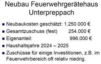 Für die Feuerwehren haben wir viel ausgegeben, nach dem entwickelten Feuerwehrbedarfsplan Anschaffungen getätigt. Es geht weiter, Feuerwehrautos (Reutersbrunn, Bramberg, Ebern, die bestellt sind, aber noch nicht geliefert wurden) und dem Feuerwehrhausneubau Unterpreppach. Investition in Sicherheit ist wichtig, aber im leistbaren Rahmen, wir müssen hier bremsen, es gibt auch andere dringende Aufgaben.