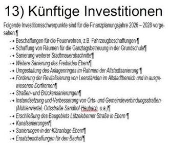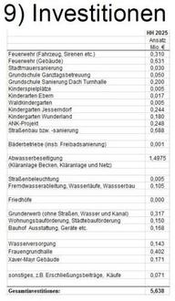 Wir haben im Investitionsplan für 2025 keine großen Dinge eingeplant und lagen dennoch bei fast 7 Mio. Euro. Das ist schon an der finanziellen Belastungsgrenze. Dabei sind hier noch keine größeren Projekte, wie ein Feuerwehrhausneubau Ebern, die Sanierung der Gebäude des Bauhofes, Straßensanierungen in größerem Umfang und die Maßnahmen aus dem ISEK, die Marktplatzsanierung und Neugestaltung, enthalten. Diese stehen in den nächsten Jahren an.