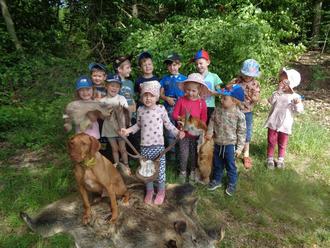 Drei beeindruckende Tage hat der Fuchsbau im Wald verbracht und zwar vom Dienstag 14. Mai bis Donnerstag 16. Mai, mit Herrn Marcel Waffler von der Forstbetriebsgemeinschaft Haßberge und seinem Hund Arko. Nachdem die Kinder erst einmal den Wald selbständig erkundet und u. a. riesige Nacktschnecken und die buntesten Raupen entdeckt hatten, sprachen wir mit Herrn Waffler über das Berufsbild des Försters und was man eigentlich alles aus Holz machen kann bzw. was wir alles davon überhaupt im Kindergarten haben. Am zweiten Tag gab es für uns beeindruckendes Anschauungsmaterial! Wir durften uns das Fell eines Waschbären, eines Fuchses und sogar eines Wildschweines anschauen, berühren und etwas über die Tiere erfahren. Danach durfte jeder Freiwillige noch ein Bild mit einem Hirschgeweih machen lassen. Die Kinder durften das Fuchsfell dann im Wald verstecken und Arko musste es „der Nase nach“ suchen und finden. Aber dann wurde es erst so richtig spannend! Jeder Mutige durfte auf den großen Jägerstand im Wald klettern, natürlich mit Unterstützung der Erwachsenen. Selbst Arko ist mit Hilfe seines Herrchens in die Höhe geklettert! Am letzten Tag durften sich die Kinder in Gruppen auf die Suche nach unterschiedlichen Waldmaterialien machen und in Eierkartons sammeln.